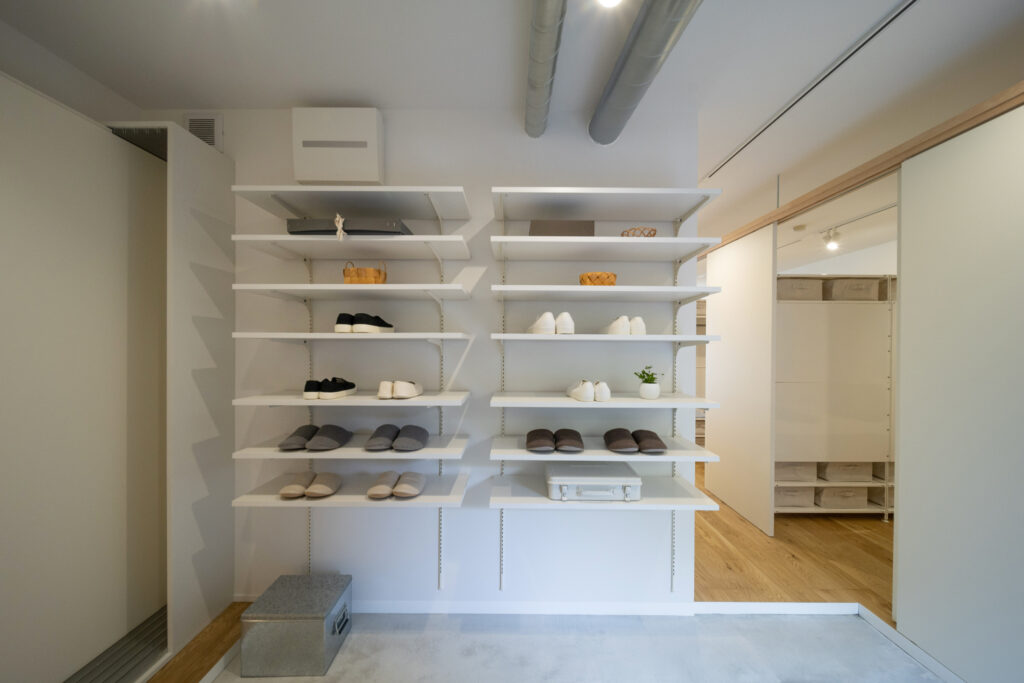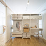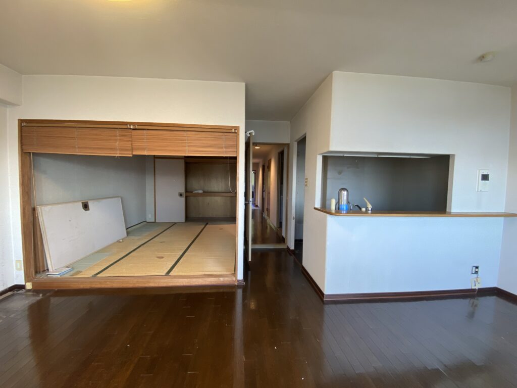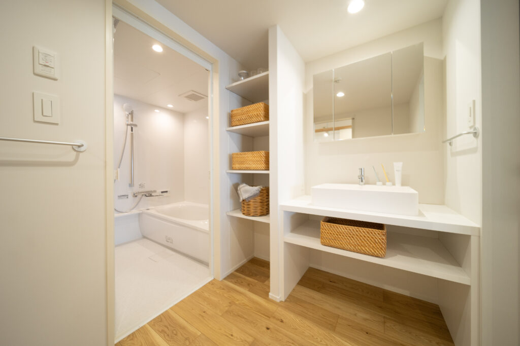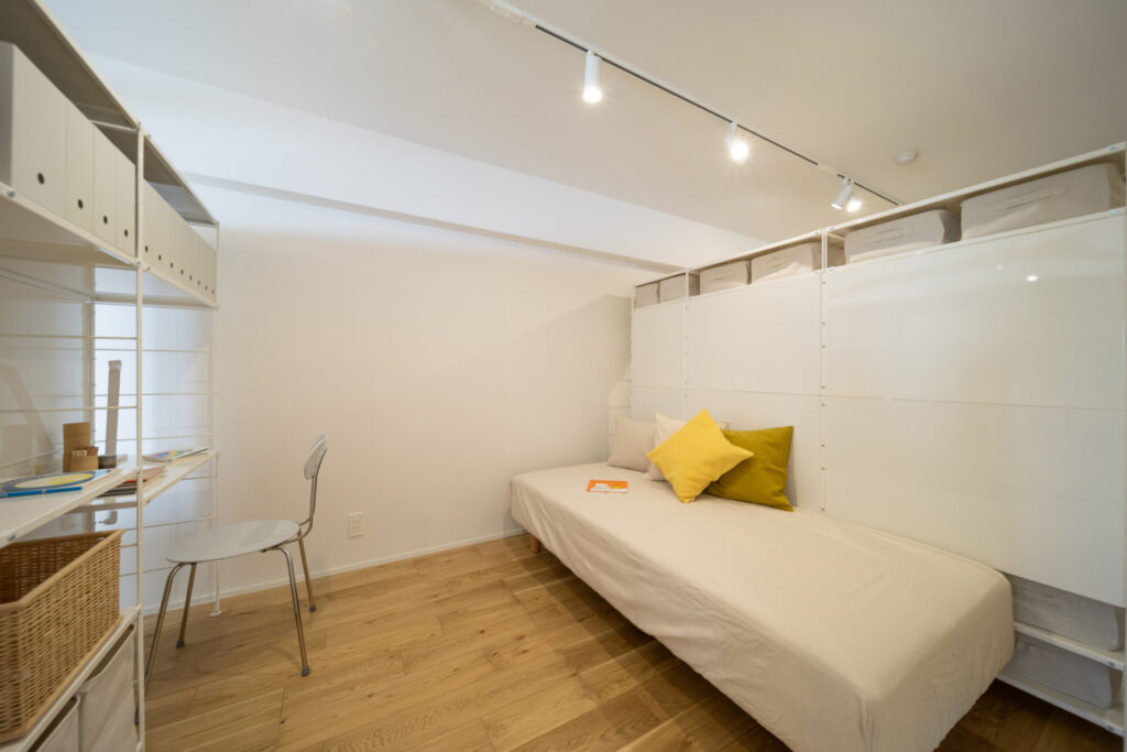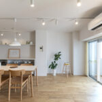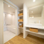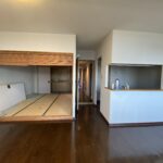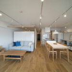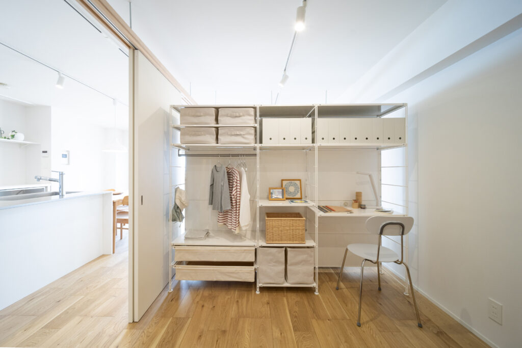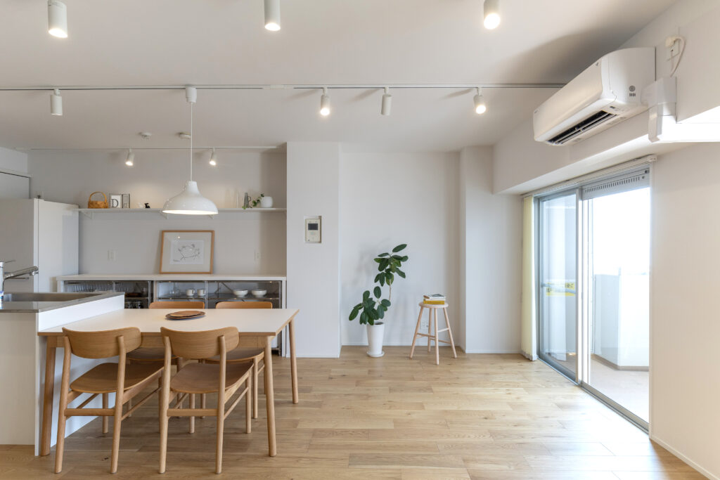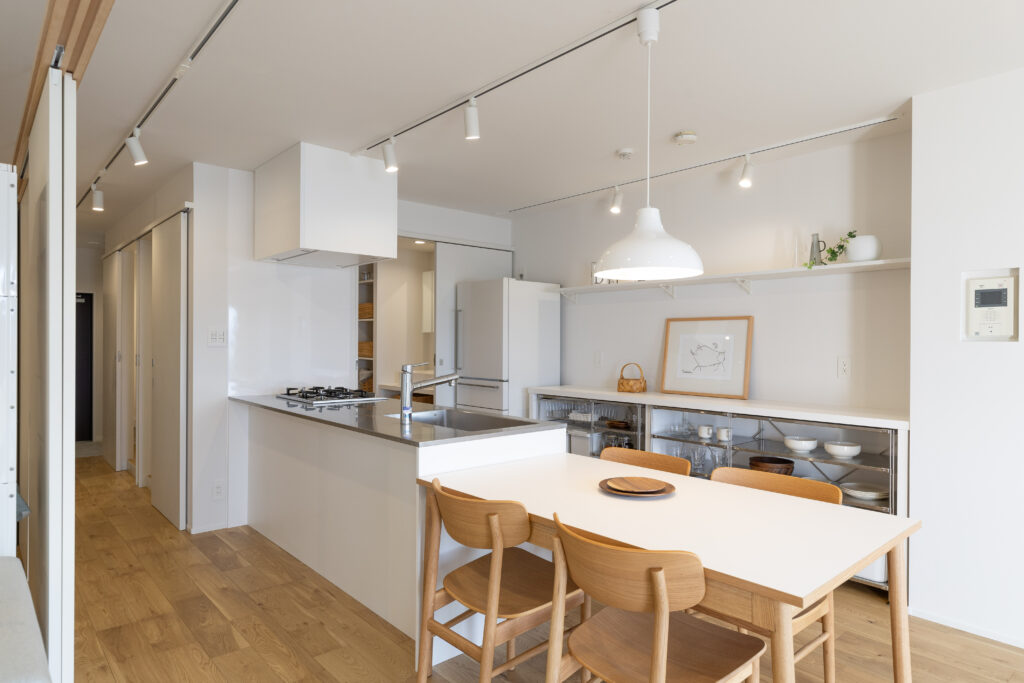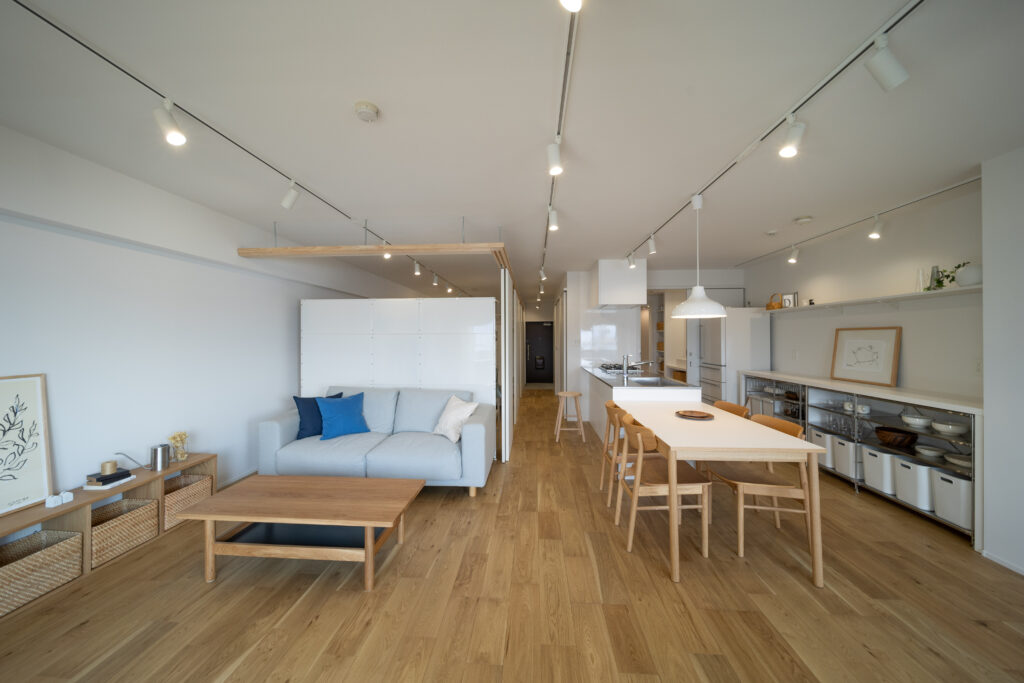 築28年の中古マンションを購入。3LDKの室内を一度スケルトン状態にし、水廻りをまとめることで生活動線を整理しながら、室内の奥まで光が届くように計画を立てました。また、ライフスタイルの変化に柔軟に対応できるよう、間取りを自由に変更できる空間設計を行っています。